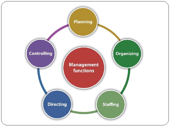 Functions of Management � Management Functions � According to the functions approach managers perform certain activities to efficiently and effectively coordinate the work of others. They can be classified as � 1) Planning involves defining goals, establishing strategies for achieving those goals, and developing plans to integrate and coordinate activities. � 2) Organizing involves arranging and structuring work to accomplish the organization’s goals. � 3) Leading involves working with and through people to accomplish organizational goals. � 4) Controlling involves monitoring, comparing, and correcting work performance. Since these four management functions are integrated into the activities of managers throughout the workday, they should be viewed as an ongoing process and they need not the done in the above sequence.