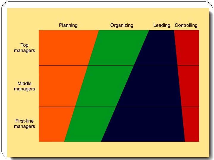 Levels of Management � Managers can be classified by their level in the organization, particularly in traditionally structured organizations—those shaped like a pyramid � 1) First-line managers (often called supervisors) are located on the lowest level of management. � 2) Middle managers include all levels of management between the first-line level and the top level of the organization. � 3) Top managers include managers at or near the top of the organization who are responsible for making organization-wide decisions and establishing plans and goals that affect the entire organization. � The changing nature of organizations and work often requires employees in formerly nonmanagerial jobs to perform managerial activities. Non managerial jobs are those where one works directly on a job and had no one reporting to him. � Mary Parker Follet defines management as, “The art of