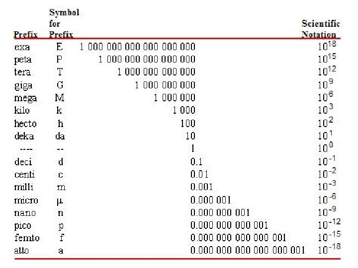 Prefixes in SI • SI uses prefixes to shorten measurements (much like scientific notation) • These are put in front of measurements to give a certain place value (multiple) of the unit. – Ex) Rather than 1000 m, you can write 1 km, because kilo means 1000. – Ex) Rather than writing 0. 000001 g, you can write 1 μg or 1 microgram, because micro means 10 -6
