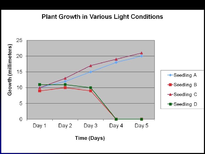 Multiple Sets of Data When graphing multiple data sets on the graph, use a distinctive color of pen, or style of line, for each data set. l Place an example of the color or line style off to the side of the graph (Key) l Label it with the name of the information being displayed. For example: Seedlings l