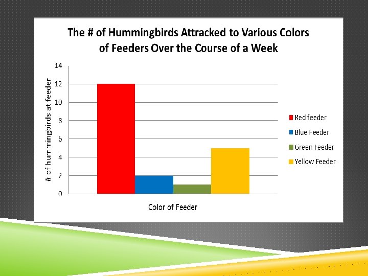 EXAMPLE EXPERIMENT Controls: • • • Same height & tree Same type of feeder Same food inside Tested the same amount of time (This what stays the same) Independent Variable: • Color of the feeder (it’s what we changed!) Dependent Variable: • Number of hummingbirds who come to the feeder (it all depends on if they like the color of the feeder!)