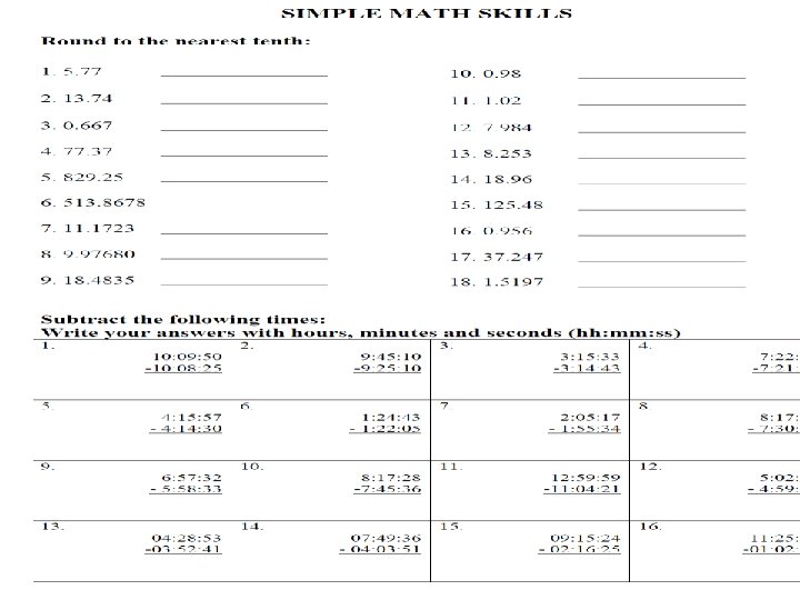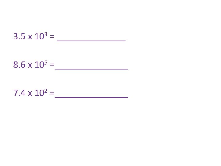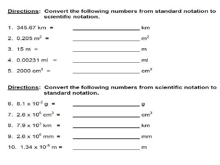 Begin Class Assignment If Time Allows • • • • • Scientific Notation Worksheet Convert the following numbers into scientific notation: 1) 3, 400 ________________ 2) 0. 000023 ________________ 3) 101, 000 ________________ 4) 0. 010 ________________ 5) 45. 01 ________________ 6) 1, 000 ________________ 7) 0. 00671 ________________ 8) 4. 50 ________________ Convert the following numbers into standard notation: 9) 2. 30 x 104 ________________ 10) 1. 76 x 10 -3 ________________ 11) 1. 901 x 10 -7 ________________ 12) 8. 65 x 10 -1 ________________ 13) 9. 11 x 103 ________________ 14) 5. 40 x 101 ________________ 15) 1. 76 x 100 ________________ 16) 7. 4 x 10 -5 ________________