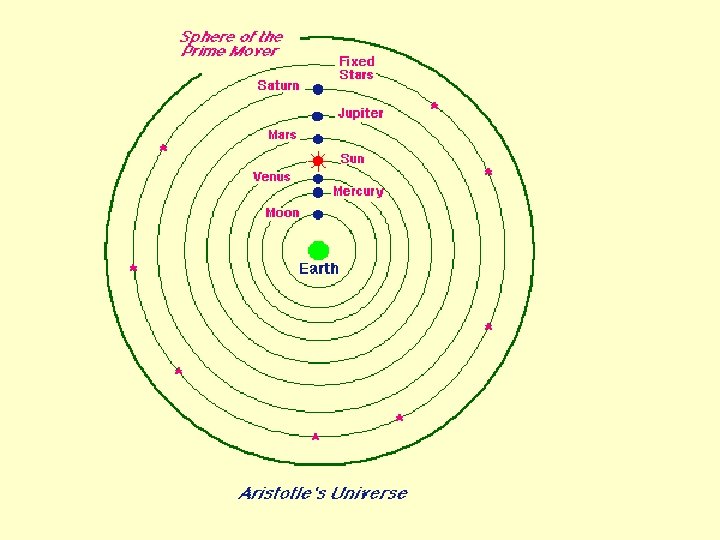 Aristotle § Astronomy: § Geocentric § Crystal spheres § All circular (perfect) § Physics § Body in motion as long as whatever moves it in contact with it § Straight line motion on earth; circular motion in heaven