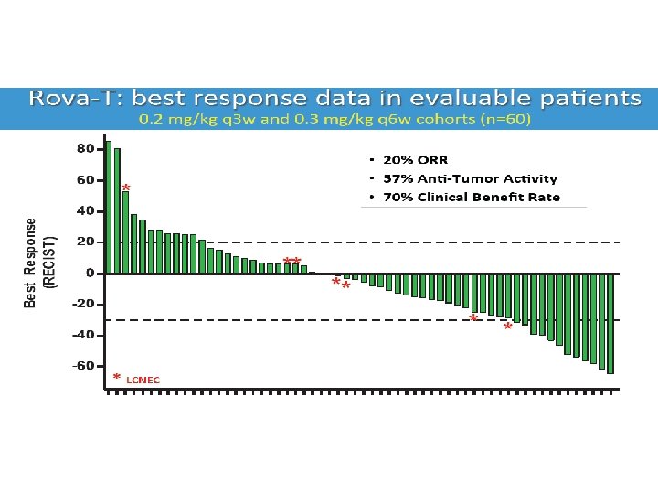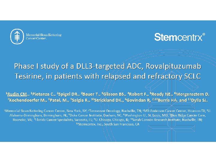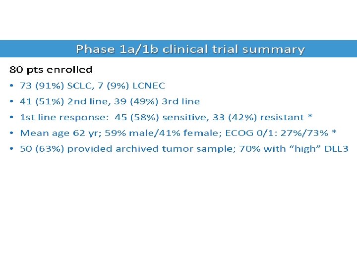 Results support biomarker-guided phase II studies Overall response rates Rova-T; SC 16 LD 6. 5 Topotecan† All Pts & dose levels DLL 3+ Ph 1 b Cohorts 2 nd Line 17% 22% 40% 3 rd Line No Approved Drug 17% 38% Sensitive to C/E 23% 24% 62% Resistant to C/E 9% 14% 20% Durability of Response at RP 2 D (0. 3 mg/kg q 6 w): 182+ days †Tabulated from published trial data with Topotecan: von Pawel (2014) JCO, Jotte (2011) JCO, O’Brien (2006) JCO, Huber (2006) Eur Respir J, von Pawel (1999) JCO, and Ardizzoni (1997) JCO