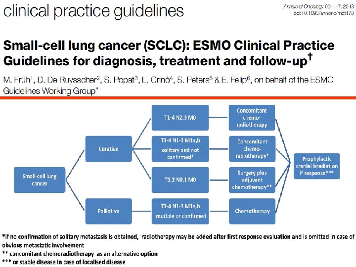 SCLC/LCNEC: State of the art treatment u u u Platinum (either cis or carbo) combination chemotherapy (i. e cis/carbo-etoposide) x 4 -6 courses q 3 weeks “standard of care” 1 st line therapy for both LD and ED Combined chemotherapy and thoracic radiotherapy (preferably early concurrent) standard of care for LD Possible role of upfront surgery in very limited disease Frail pts should receive profilactic G-CSF +/- antibiotics 2 a line therapy: Topotecan o CAV or PE-rechallenge based on treatment-free interval (refractory vs sensitive disease) PCI for pts with both LD or ED with good response to 1 st line therapy