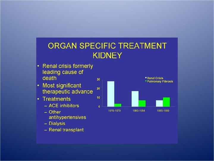 Long-term Outcomes of Scleroderma Reanl Crisis • Steen V, et al, Annals of Int Med, 2000 – Prospective observational cohort w 5 -10 yr f/u – 145 pts with SRC who received continuous ACE-I, and 662 pts with SCL who did not have renal crisis – Results: • At time of renal crisis, 75% pts had SCL sxs for <4 yrs • 61 % pts with SRC had good outcomes (55 received no HD, 34 received temp HD). Only 4% of later group progressed to ESRD • >1/2 of pts who began HD could dc it 3 to 18 mths later • Survival of pts in good outcome group was similar to pts with diffuse SCL without renal crisis