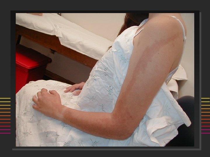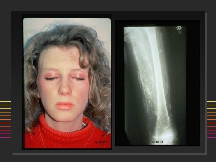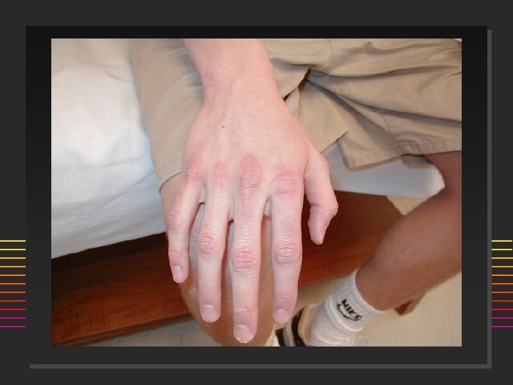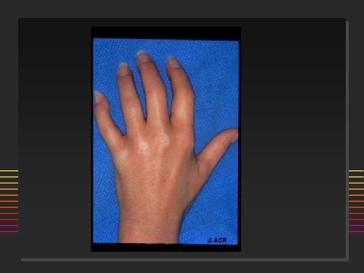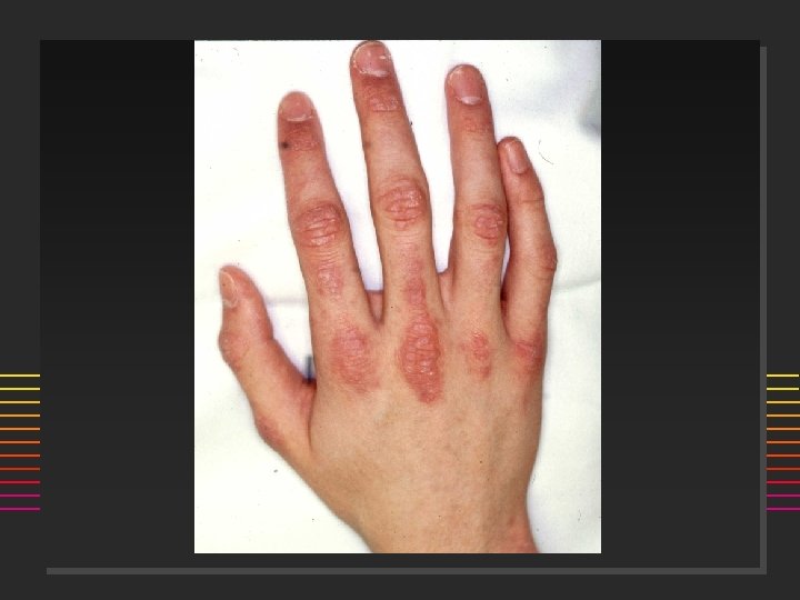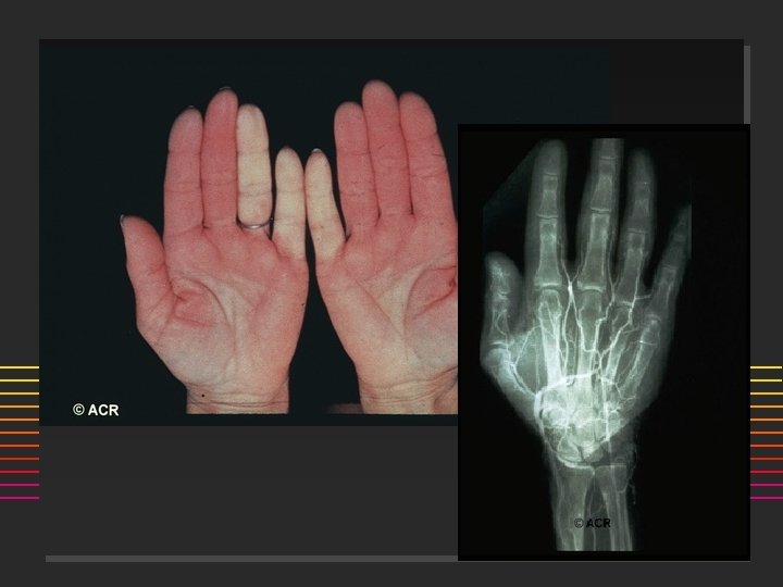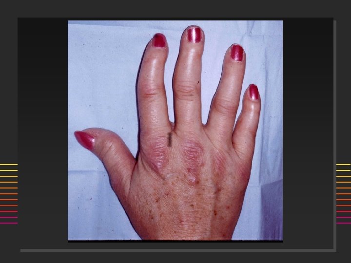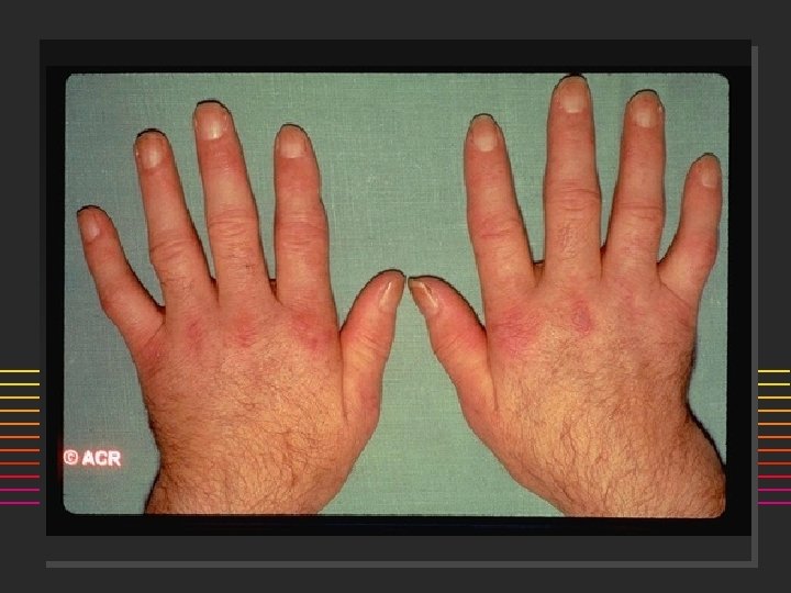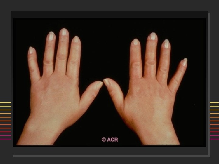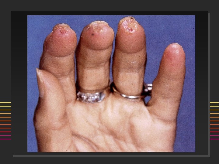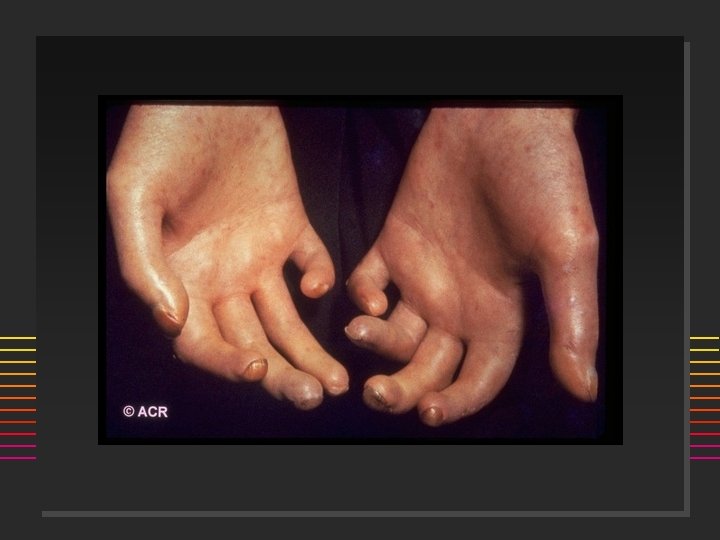 Scleroderma: Onset n n 80% females Age: 50% are < 40 yrs @ onset (20 -50) ] n n n Incidence 20/million/year Raynauds Swollen or puffy digits Loss of skin folds, no hair growth Digital pulp sores/scars Arthralgias >> Arthritis