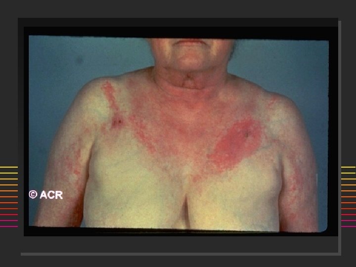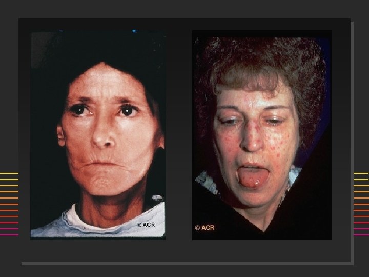 Polymyositis Dermatomyositis n n n n F: M = 2: 1 Acute onset Weakness (+ myalgia): Proximal > Distal Skeletal muscle: dysphagia, dysphonia Sx: Rash, Raynauds, dyspnea 65% elevated CPK, aldolase 50% ANA (+) 90% +EMG; 85% + muscle biopsy