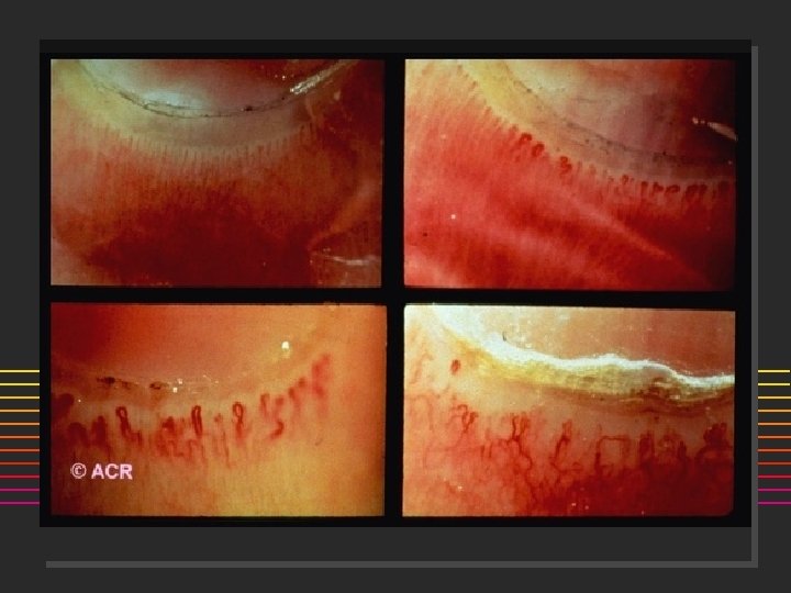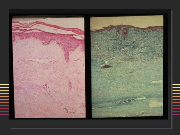 Scleroderma A disorder of Collagen, Vessels n n n Etiology: unknown? Autoimmune disorder suggested by the presence of characteristic autoantibodies such as ANA, anticentromere and anti-SCL-70 antibodies. Pathology: ] ] n Early dermal changes lymphocytic infiltrates primarily of T cells Major abnormality is collagen accumulation with fibrosis. Small to medium-sized blood vessels, which show bland fibrotic change. Small thrombi may form on the altered intimal surfaces. Microvascular disease Cold Normal PSS