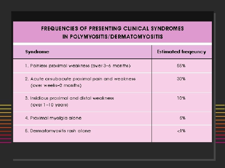PM/DM Diagnosis Symmetric progressive proximal weakness n Elevated muscle enzymes (CPK, LFTs) n Muscle biopsy evidence of myositis n EMG: inflammatory myositis n Characteristic dermatologic findings n