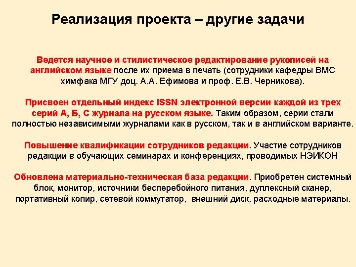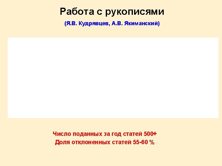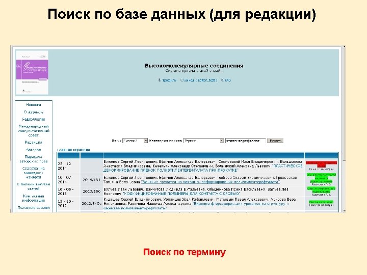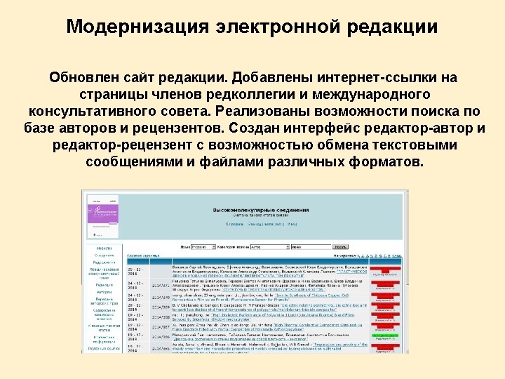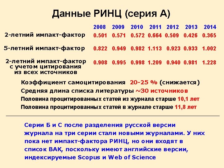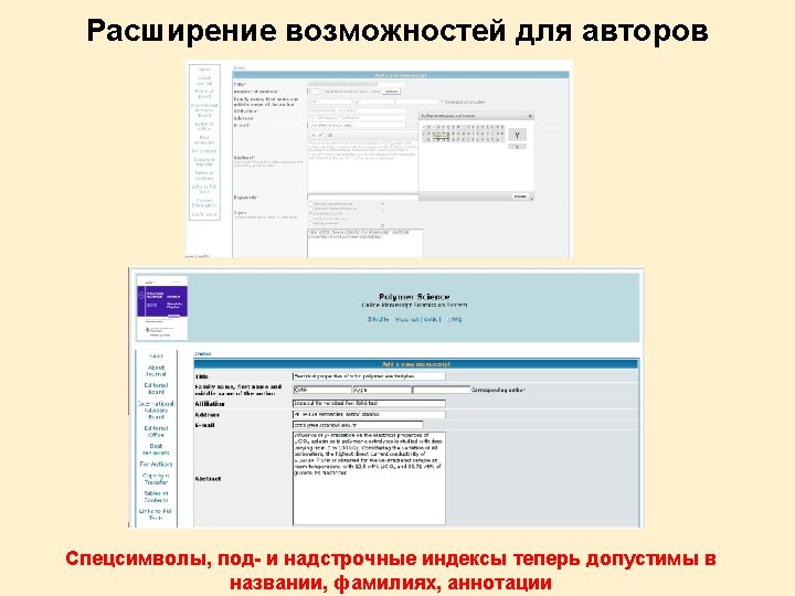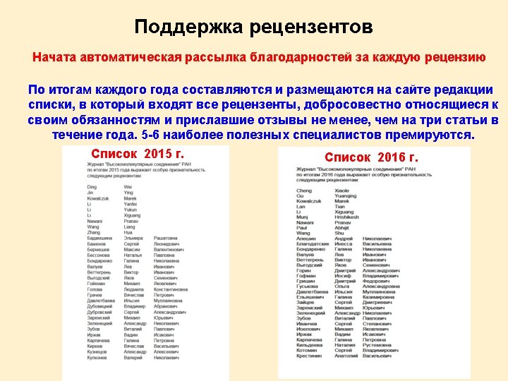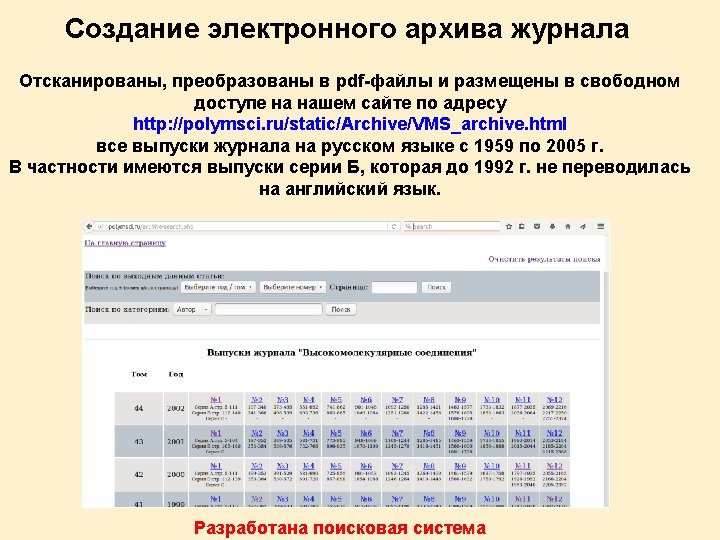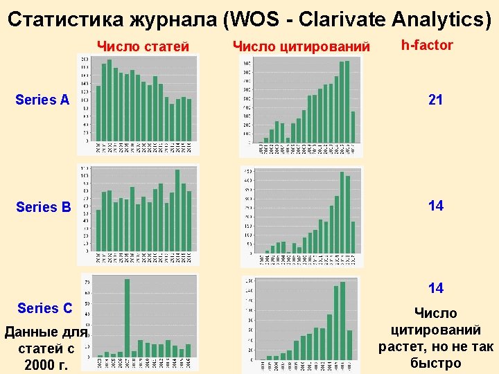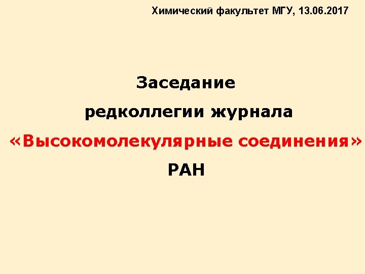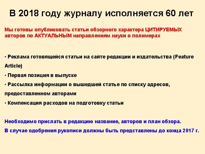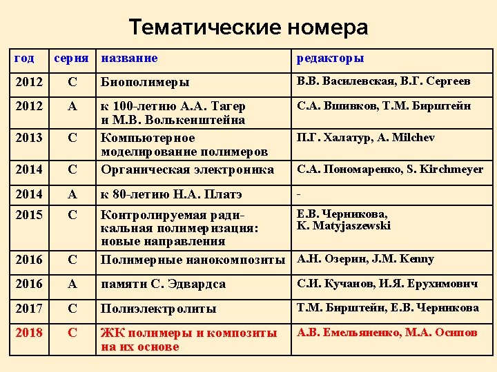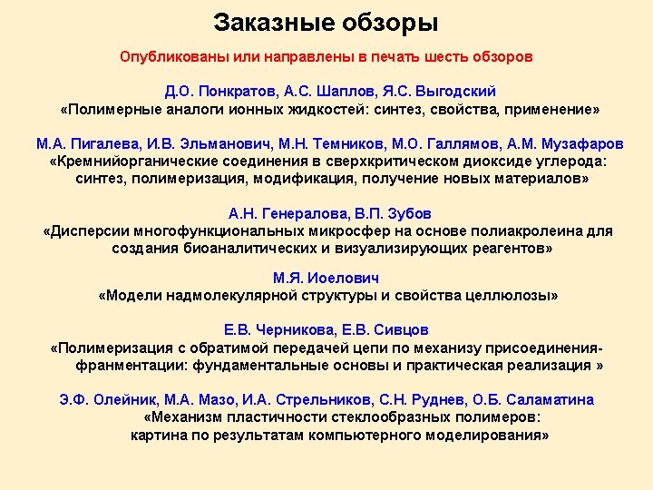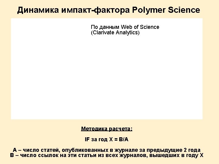 Наиболее цитируемые статьи Polymer Science, опубликованные с 2000 г. Author Title Pub. year Cited 1 Oleinik, EF Plasticity of semicrystalline flexible-chain polymers at the microscopic and mesoscopic levels 2003 77 2 Chernikova, EV; Terpugova, PS; Garina, ES; Golubev, VB Controlled radical polymerization of styrene and n-butyl acrylate mediated by trithiocarbonates FEB 2007 50 3 Bazilevskii, AV; Entov, VM; Rozhkov, AN Breakup of an Oldroyd liquid bridge as a method for testing the rheological properties of polymer solutions JUL 2001 39 4 Abramchuk, SS; Grishin, DA; Kramarenko, EYu; Stepanov, GV; Khokhlov, AR Effect of a homogeneous magnetic field on the mechanical behavior of soft magnetic elastomers under compression FEB 2006 38 5 Potemkin, II; Palyulin, VV Comblike macromolecules FEB 2009 36 6 Zaremski, MYu; Kalugin, DI; Golubev, VB Gradient copolymers: Synthesis, structure, and properties JAN 2009 35 7 Nikitin, LV; Mironova, LS; Stepanov, GV; Samus, AN The influence of a magnetic field on the elastic and viscous properties of magnetoelastics APR 2001 35 8 Adymkanov, SV; Yampol’skii, YP; Polyakov, AM; Budd, PM; Reynolds, KJ; Mc. Keown, NB; Msayib, KJ Pervaporation of alcohols through highly permeable PIM-1 polymer films APR 2008 35 9 Mourya, VK; Inamdar, NN; Choudhari, YM Chitooligosaccharides: Synthesis, Characterization and Applications JUL 2011 35 10 Chernikova, EV; Tarasenko, AV; Garina, ES; Golubev, VB Controlled radical polymerization of styrene mediated by dithiobenzoates as reversible addition-fragmentation chaintransfer agents OCT 2006 33 Список мало меняется со временем (самая свежая статья 2011 г. ) Среднее число цитирований на одну статью с 1980 г. Серия А - 3. 11; Серия B – 2. 02; Cерия С – 4. 04 По данным WOS