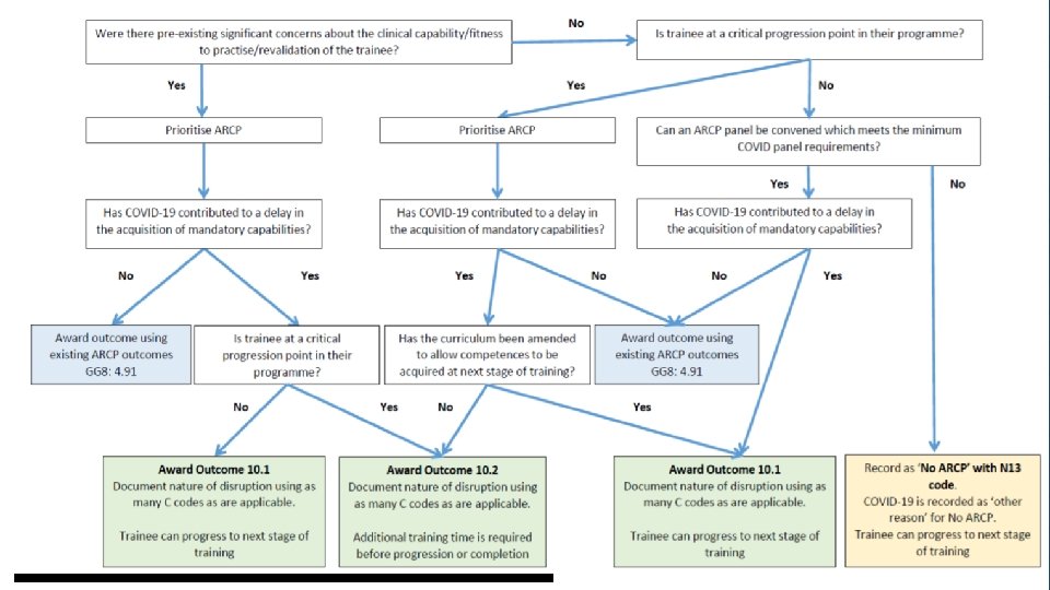 TRAINEE NOT AT CRITICAL PROGRESSION POINT They have achieved the minimum amended curricular requirements. SOAR and absence declarations are submitted. If not met the minimum amended curricular requirements and it was not due to COVID Outcome 1 (or Outcome 6) Outcome 2 or 3 depending upon whether additional time required If not met the minimum amended curricular requirements and it was due to COVID Outcome 10. 1 or 10. 2 depending whether additional time is required. This decision will be based on the extent of the curricular requirements to be achieved (Note SEB agreed guidance slide 11) Add C codes that apply.