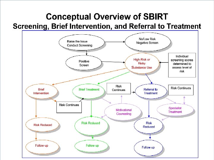 Basic Elements of SBIRT • Screening—How, Who, and When? • Treatment matching linked to screening results • Brief intervention • Brief treatment • Referral to standardized assessment and more intensive treatment • Continued monitoring