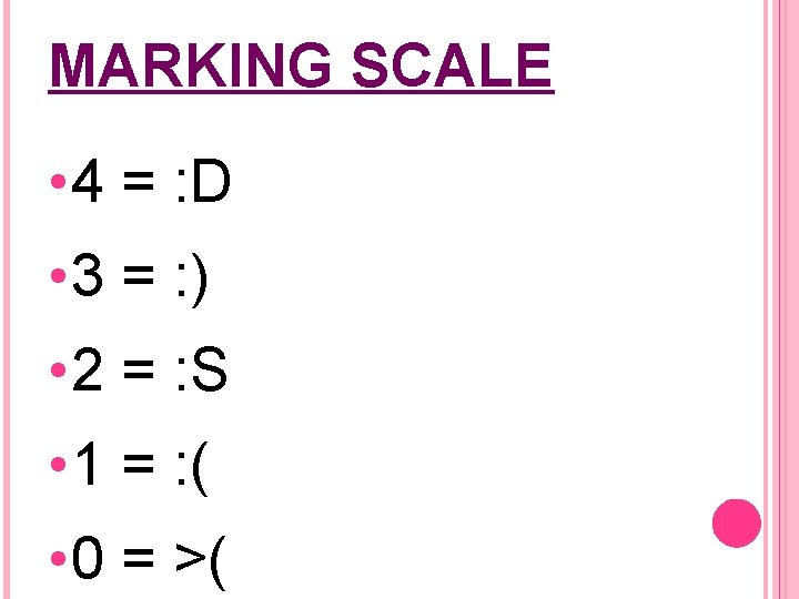 MARKING SCALE • 4 = Excellent • 3 = Very Good • 2 = Average • 1 = Poor • 0 = Incomplete