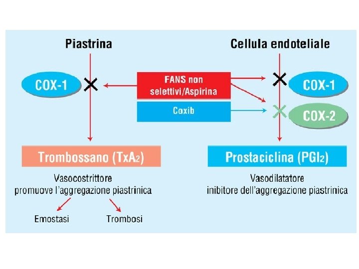 Condizioni normali Aspirina PGI 2 TXA 2 PGI 2 Inibitori selettivi di COX-2 NSAID non selettivi PGI 2 TXA 2 Piastrina attivata TXA 2 PGI 2 Cellula endoteliale Prostaciclina PGI 2 P. Minuz basata sul lavoro di Fitzgerald GA, Patrono C. NEJM 2001; 345: 433 -42