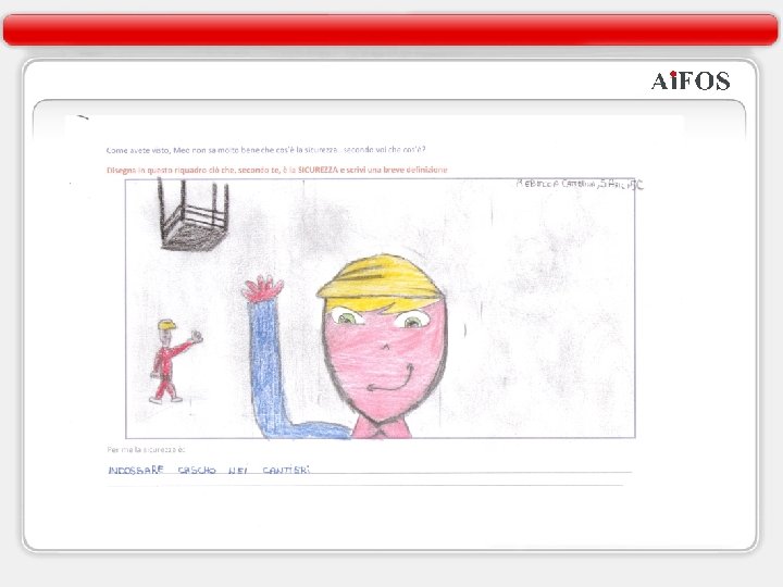 Il caso Marcegaglia Esperienza di Ai. FOS, che sottolinea l’importanza del disegno, è il caso Marcegaglia. In occasione dell’evento “Fabbrica Aperta” le famiglie dei lavoratori, con i propri figli, sono stati invitati a visitare i luoghi di lavoro. In uno spazio apposito erano stati predisposti colori e fogli per far sì che i bambini potessero disegnare o riprodurre il luogo di lavoro dei genitori appena visitato. Nello specifico i bambini hanno disegnato segnali e oggetti inerenti la sicurezza dei genitori. I disegni al termine di questa attività, sono stati affissi vicino alle postazioni di lavoro dei genitori. Questo semplice gesto, crea a livello psicologico nel lavoratore, maggior attenzione e scrupolo nel rispetto di quanto richiesto dalla segnaletica e dalla normativa in generale. Infatti il lavoratore tenderà a non disattendere quanto riportante nel disegno del figlio. Un caso questo molto significativo di quanto la sicurezza possa passare dai figli ai genitori attraverso un semplice disegno. 14