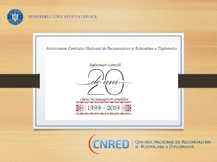 Scurt istoric • În 1 decembrie 1995 a fost înfiinţat Centrul NARIC ca parte a Reţelelor ENIC-NARIC, în conformitate cu Acordul nr. 95 -PECO-SO-0019 încheiat cu Uniunea Europeană, coordonat de Comisia Europeană prin DG XXII, Unit A 2. • A funcţionat ca parte din Agenţia Naţională SOCRATE. • Centrul Naţional de Recunoaştere şi Echivalare a Diplomelor a fost înfiinţat în 29 ianuarie 1999 prin Hotărârea de Guvern nr. 49 şi a preluat atribuţiile Centrului ENIC-NARIC. • CNRED funcţionează ca structură în cadrul Ministerului Educaţiei Naționale.