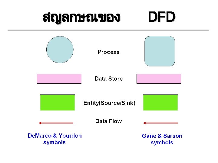 Data Flow Diagram: DFD (ตอ ) • Graphical system model that shows all main requirements for an IS in one diagram Inputs/outputs Processes Data storage • DFD integrates processing triggered by events (event table) with the data entities modeled by ERD