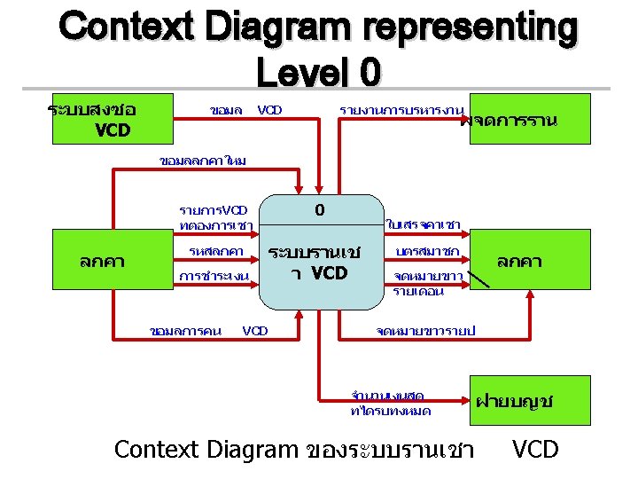 DFD: Context Diagram (ตอ ) • Context Diagram is DFD that summarizes all processing activity for the system or subsystem • Highest level (most abstract) view of system • Shows system boundaries • System scope is represented by a single process, external agents, and all data flows into and out of the system • แสดงหมายเลข Process เปนหมายเลข 0
