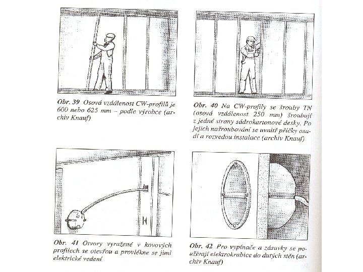 Pracovní pochody při montáži • • • vytyčení příčky montáž nosných profilů opláštění jedné strany profilů sádrokartonem vložení tepelné- zvukové izolace mezi profily opláštění druhé strany příčky tmelení spar a hlav šroubů vtlačení výztužné pásky do tmele broušení zatmelených spar nové tmelení opětné broušení povrchová úprava malířským nátěrem na sádrokarton