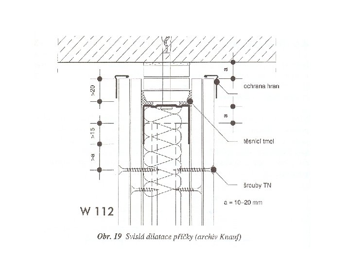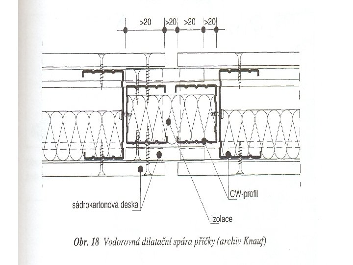 Vytvoření dilatačních spar • v důsledku tepelné a vlhkostní roztažnosti materiálu • vlivem rozdílného sedání konstrukce Dilatace se provádí v opláštění i v nosné konstrukci Opomenutím dilatace mohou vzniknout praskliny v sátrokartonových konstrukcích