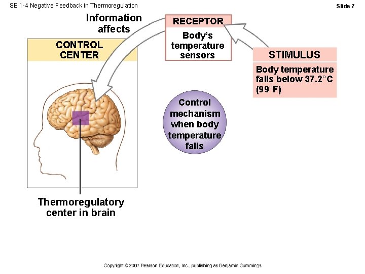 SE 1 -4 Negative Feedback in Thermoregulation Information affects CONTROL CENTER Slide 7 RECEPTOR Body’s temperature sensors STIMULUS Body temperature falls below 37. 2°C (99°F) Control mechanism when body temperature falls Thermoregulatory center in brain