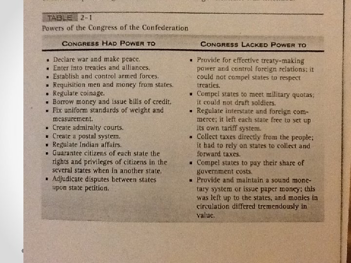nd 2 First try: Continental Congress • States loyal to states first. • From what government are they just becoming independent? o Very wary of a strong, central government. • The Articles of Confederation— o 1 state=1 delegate o Went into effect 1777; not approved until 1781 o WHY? • It took 9 of 13 states to approve any law (or ratification) • Limited power to regulate trade between states. So states could impose tariffs (taxes) on imported goods=strained relationships. • Congress not given power to levy taxes (could only borrow or beg!) o A war to pay for!!