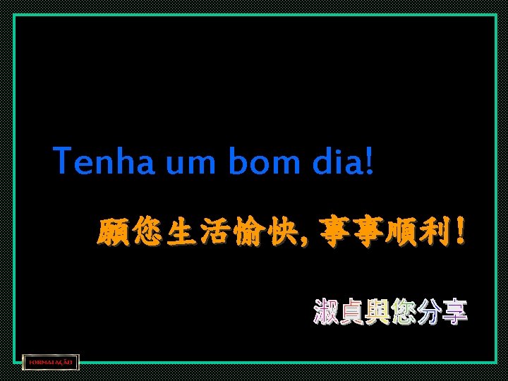 Quando você receber este e-mail envie para as pessoas que você ama, que a paz de Deus esteja com você hoje. Que você tenha a certeza de que está exatamente onde deveria estar. Que você use as graças que recebeu e transmita o amor que lhe foi dado. Que você se sinta feliz por ser filho de Deus. Que a Sua presença suporte o seu corpo e permita à sua alma cantar, caminhar ao sol, pois ele brilha para todos nós. Amém 當你收到本訊息後,請你轉發給你所愛的人們。 願上主的和平從今天起與你同在。 願你能隨遇而安,在身處之處發揮恰當。 願你享用天賜之福,傳播所得的愛。 願你懂得感恩。 願你的存在能支撐穩你的軀體及容許你的靈魂歌唱, 步向照亮我們的太陽。 阿門。