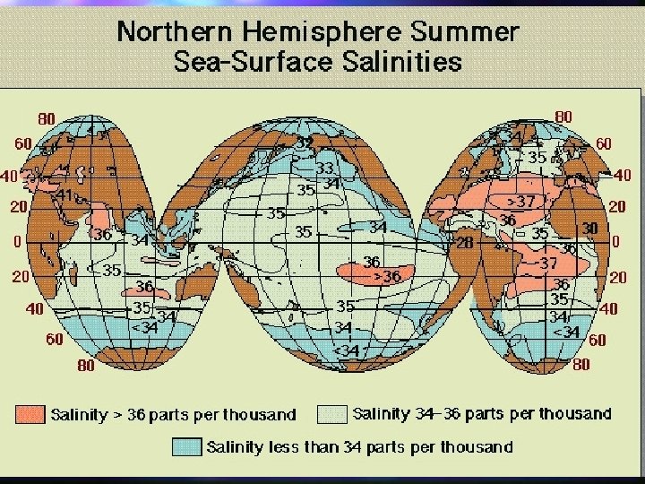n n n On average, concentration of dissolved salts, i. e. , the salinity, in seawater is 3. 5% or 35‰. The relative abundances of the ions listed above does not change, even though salinity does; are said to be conservative. Relative abundances of minor and trace constituents do vary