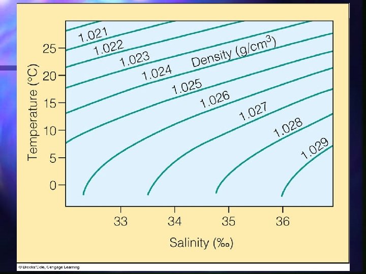 Density - mass per unit volume (grams/cm 3) n density of water phases (ice, liquid, vapor) due to structural changes at molecular level n density maximum at 4°C in pure water n Major role in deep ocean circulation and water column structure and stability n