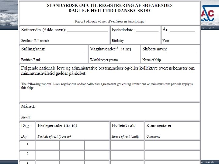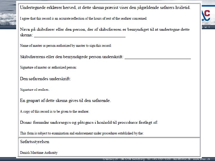 Notice and registration Section 11. In an easily accessible place on board, a record shall be posted with information about each function on board, about the employees’ periods of work at sea and in port, including watchkeeping periods for watchkeeping employees. Section 10. Records with information on seafarers' function on board and hours of work at sea and in port, including watchkeeping periods for watchkeeping seafarers, shall be kept on board and be easily accessible to the crew. These records shall be established in Danish and English and the format shall be approved by the Danish Maritime Authority.