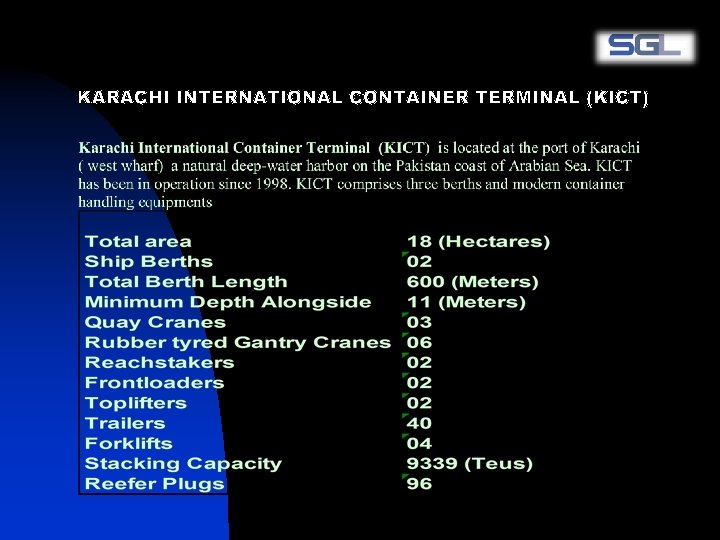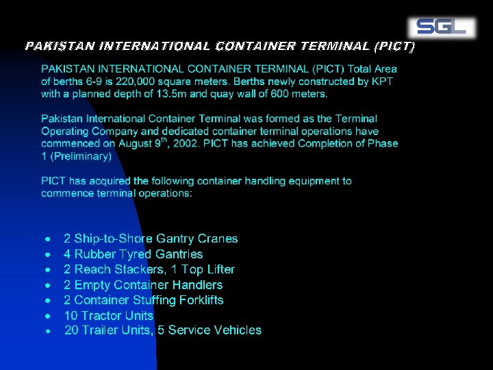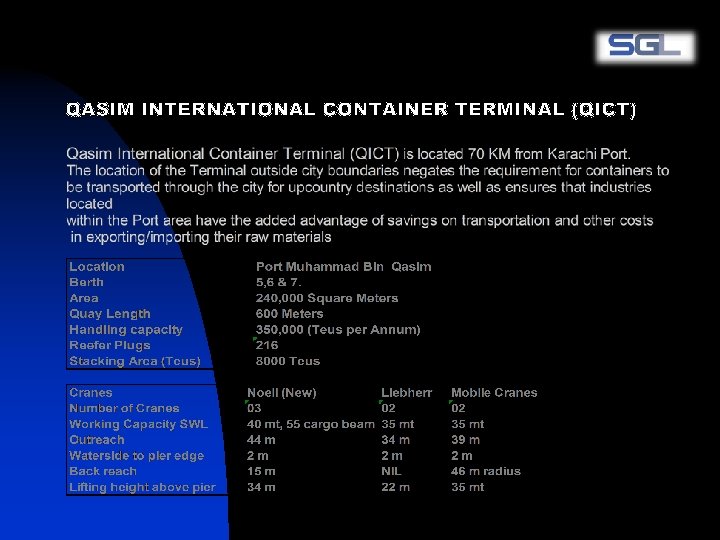 n n n SGL is a Group of Companies that has operation in the field of Shipping, Forwarding, Trucking & Custom Clearance for the last five years. It is one of the leading integrated freight forwarding company offering multiple choice to the global freight and transport industry. SGL is constantly growing in its range of services and geographic coverage, thus striving to be a leader in the global market. SGL local expertise coupled with its global coverage, has enabled customers to effect their shipments in a timely and cost-effective manner. Not surprisingly, we share a warm, mutually beneficial relationship with our customers. By keeping relationships first, we make relationships last. From this, stems our belief in offering personalized services to each and every customer.