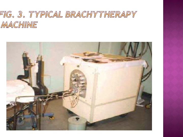 � Emission of alpha particles (helium nucleus) leads to pressure buildup in a sealed capsule. A buildup of pressure may eventually damage the encapsulation, resulting in a release of radioactivity. Remote afterloading techniques were developed in the 1970 s. 226 Ra was replaced mainly by 137 Cs and 60 Co and more recently by 192 Ir and 252 Cf. These techniques involve the use of machines which can contain a large number of relatively low activity sources, but which taken together represent a significant inventory stored in a single, relatively transportable container. An example of brachytherapy equipment is shown in Fig. 3. This type of equipment typically contains activities of up to 185 GBq (usually of 137 Cs). Remote afterloading equipment is used to arrange sources into an appropriate configuration and to transfer them either pneumatically or on the end of a cable into the patient applicator.