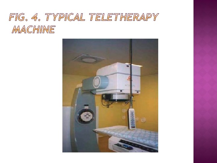 1. 2. TELETHERAPY � The other principal medical application of sealed sources is teletherapy, where a large source (typically 60 Co but possibly 137 Cs) of several hundred TBq is used, external to the body, to irradiate a tumor. 60 Co Teletherapy heads can contain up to 500 TBq of activity. An example of a 60 Co unit is shown in Fig. 4.