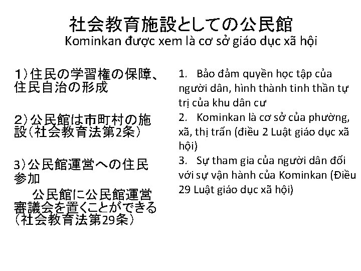 Ⅰ. 公民館の普及 Sự phổ cập của Kominkan Số liệu: Số lượng Kominkan: 17, 143 Cơ sở giáo dục xã hội khác: • Thư viện: 2, 979 • Bảo tàng: 1, 196 Cơ sở giáo dục bắt buộc: • Tiểu học: 22, 476 • Phổ thông cơ sở: 10, 915