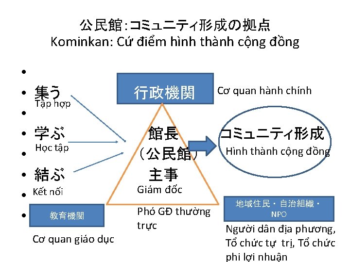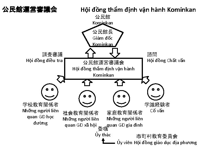 Ⅴ. 公民館のシステムと財源 V. Hệ thống kominkan và kinh phí vận hành Kominkan (trụ sở chính) – Kominkan địa phương (Trụ sở Ủy ban giáo viên) Chi nhánh (trực thuộc địa phương): Giám đốc Nguồn tài chính của chi nhánh: tự chủ <Kominkan của chúng ta>