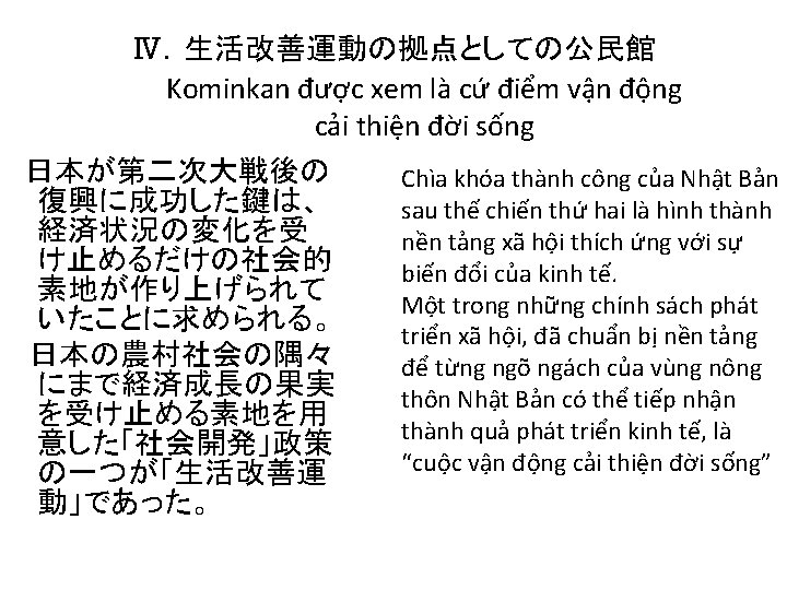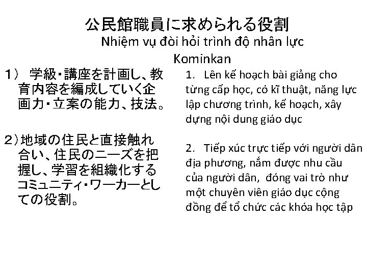Kết nối Kominkan Ⅵ. 公民館の機能 VI. Chức năng của Kominkan Đoàn thể pháp nhân Hiệp hội Kominkan Mở Hội nghiên cứu Kominkan toàn toàn quốc + Mở hội thảo, điều tra nghiên cứu + Phát hành, biên tập tạp chí Kominkan + Biểu dương chuyên viên Kominkan Mở Hội nghị Kominkan trên khắp tỉnh thành (toàn quốc: 47) Mở Lớp tập huấn Kominkan do phường, xã, thị trấn lập Khoảng 80. 000 kominkan do địa phương tự trị