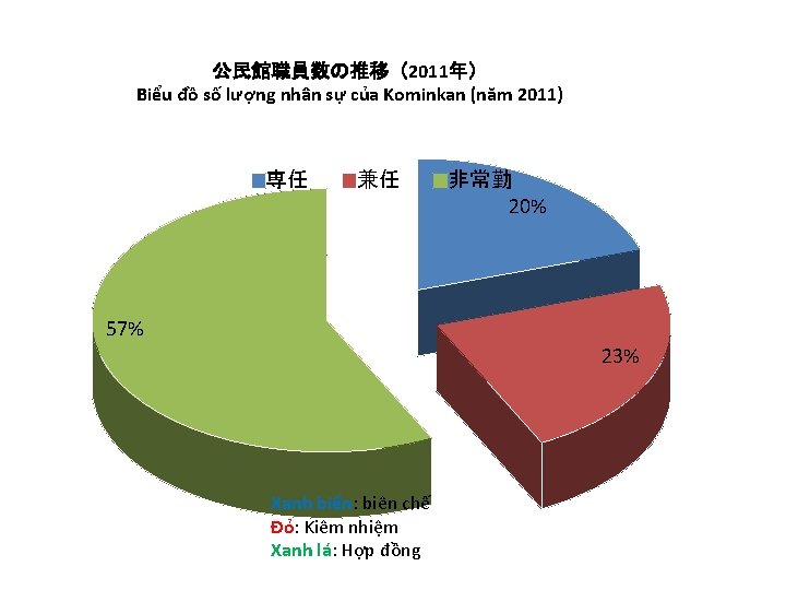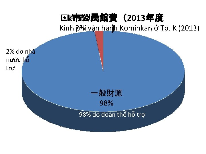 公民館の歳出(1950年文部省調査) Phân bổ chi phí hoạt động của kominkan (theo điều tra năm 1950 của Bộ GD) Chi phí hoạt động: 28. 4% Chi phí hành chính: 6. 2% Chi phí đầu tư thiết bị: 22. 5% Chi phí nhân sự: 23. 5% Chi phí khác: 19% Kinh phí bình quân của Kominkan do thành phố lập trên toàn quốc
