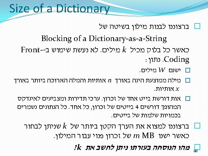 Dictionary as a Trie �How would you implement a trie on disk? �What would the runtime be for word lookup? �Assuming: � 400, 000 words �Average length of 8 �Average common prefix of length 3 What is the size of the structure you suggested? 59