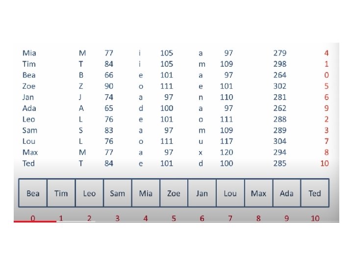 Simple Hash Calculation • Take the word Mia • Get the ASCII code for each letter – M=77, i=105, a=97 • Add them together – 279 • Divide by the number of elements in the array and take the remainder – Remainder (279 / 11) = 4
