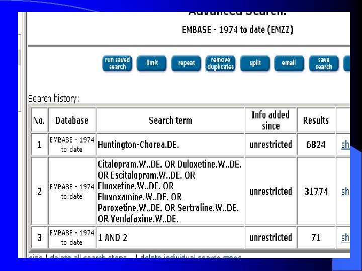 EMBASE <>EMBASE Medline vs l l l MEDLINE USA coverage 1950 onwards Wide medical coverage In process Me. SH indexing l l l EMBASE European coverage 1974 onwards Drug/pharmacology focus Updated faster EMTREE indexing 30% overlap between the Medline and Embase