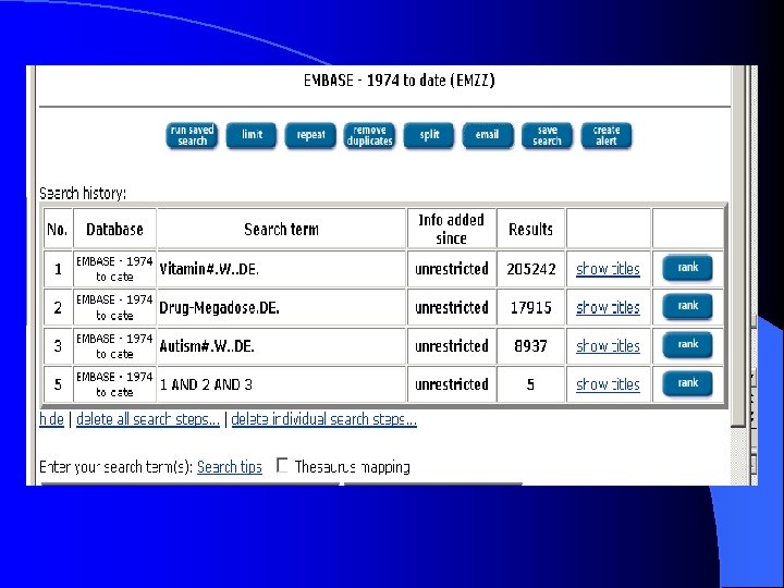 Dialog Software l Use advanced search (avoid ‘easy search’) l Embase 1974 to date or 1996 to date l 3 options to search for terms: – Thesaurus mapping – Browse headings – Enter a term EMBASE