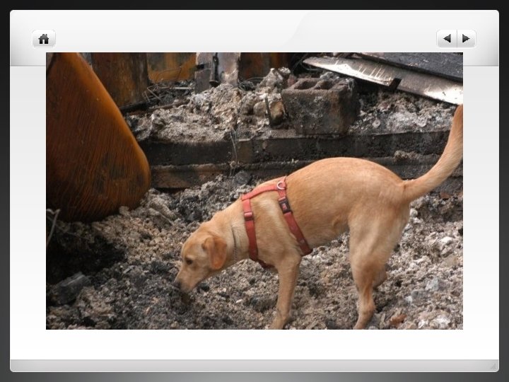 Search for accelerants l Not all combustible fluids will be consumed in fire l Some seeps into the floor l The presence of gas/kerosene/turpentine, the ignition used by arsonist, and the origin of gasoline used can all be determined from lab examination l Dogs can also be use to recognize the odor of accelerants l Water will slow evaporation rate of accelerants but will NOT interfere with examination of flammable liquid residue