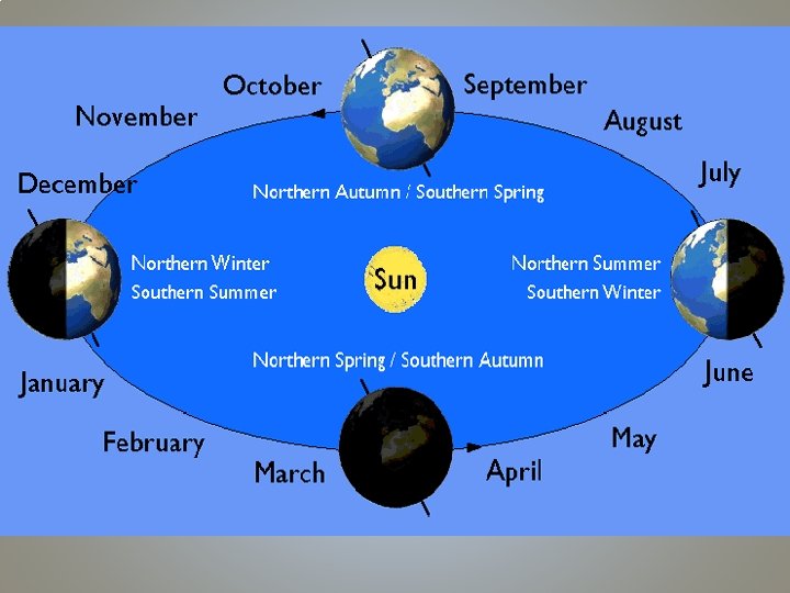 Season Vocabulary • Solstice – Period of time when one hemisphere gets its maximum area of sunlight, while the other hemisphere gets its minimum amount; the time of year when days are either longest or shortest and the angle of sunlight reaches its maximum or minimum. Winter & Summer – usually 21 st of December and June • Earth is closest to the sun in December but Northern Hemisphere is tilted away – winter solstice – colder temperatures/shorter days • Earth is furthest from the sun in June but Northern Hemisphere is tilted toward the sun – hotter temps. /longer days – summer solstice