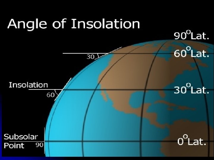 Angle of Insolation As the angle changes, it changes the amount of area on the Earth that receives that insolation (sunlight) l This is known as Intensity of Insolation l