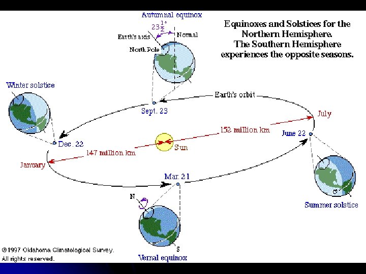 Earth Seasons The summer solstice occurs for us when the Sun is directly over head at latitude 23. 5 o N (Tropic of Cancer) l This usually occurs around June 20 th or 21 st l