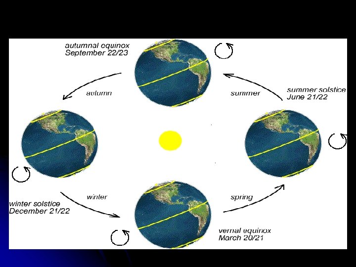 Earth Seasons During both equinoxes the Sun is directly over head on the equator at noon time. l The vernal equinox usually occurs on March 20 th or 21 st l