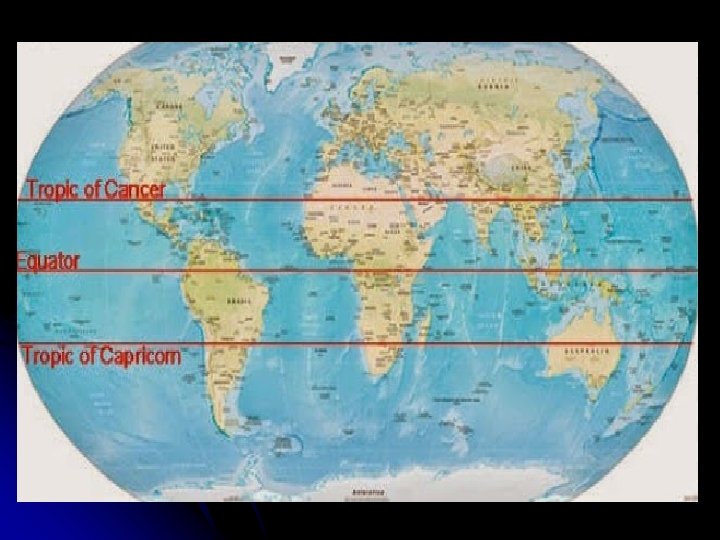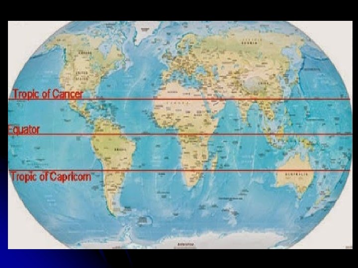 Earth Seasons The winter solstice occurs when the noon time Sun is directly over latitude 23. 5 o S which is the Tropic of Capricorn. l This usually occurs for us on December 21 st or 22 nd. l For people at 23. 5 South this would be the longest day of their year (first day of summer). l