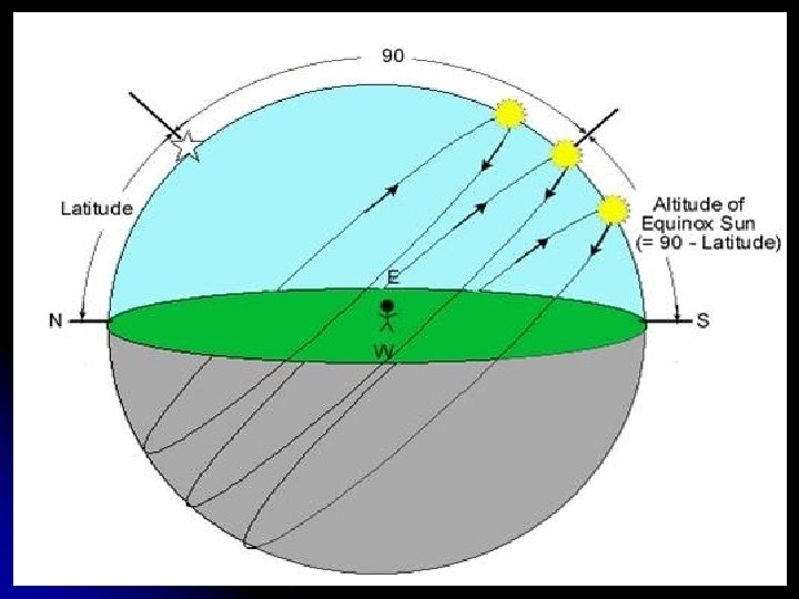 Earth Seasons The Sun’s path continues northward until the summer solstice on June 21 st. l On this day the Sun rises north of east and sets North of west creating a large path across the day time sky. l This results in about 15 hours of daylight with the Sun at a large maximum angle of 71. 5 o. l