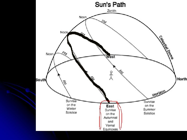 Earth Seasons From this point the Sun’s path starts to move south towards the equator. l When again the Sun rises exactly east and setting exactly west we have 12 hours of daylight. l This is the autumnal (fall) equinox. l It occurs for us on September 22 nd or 23 rd l